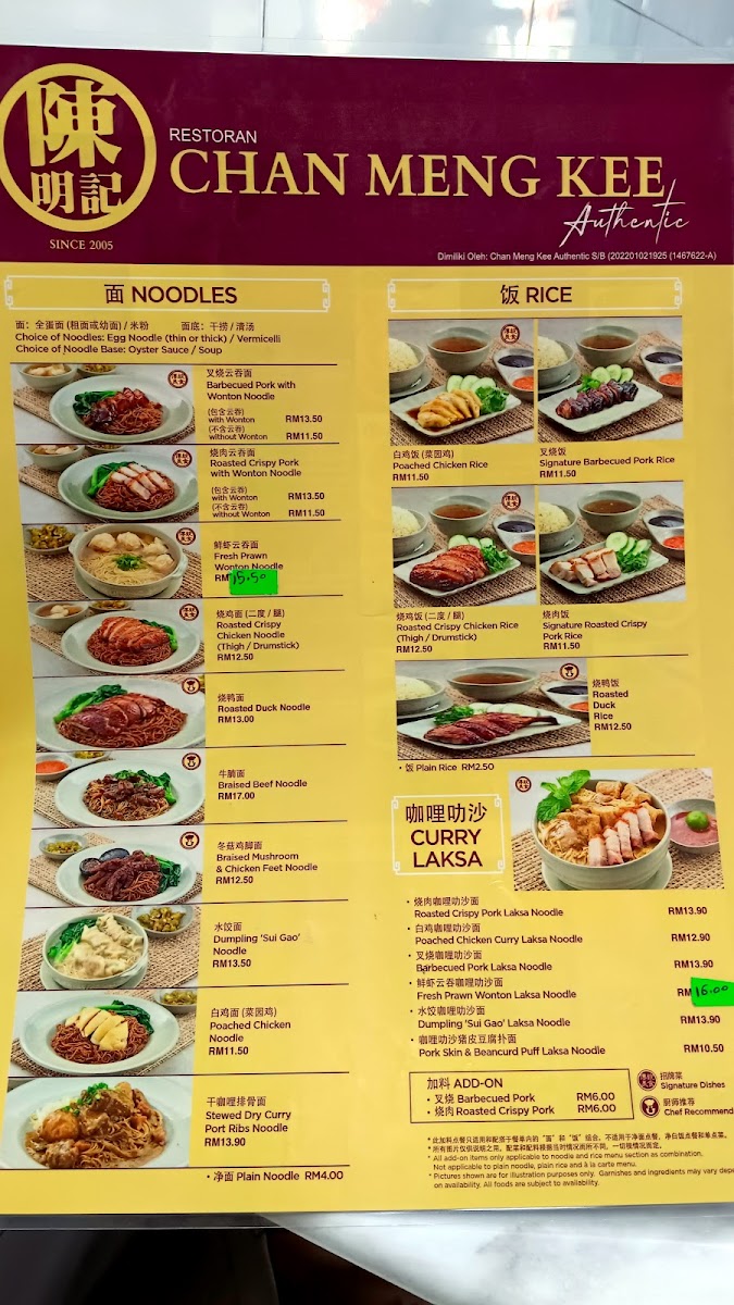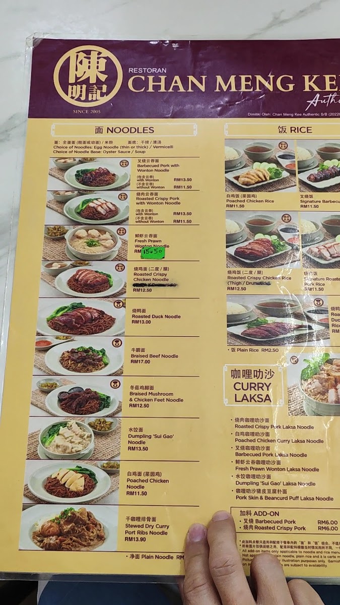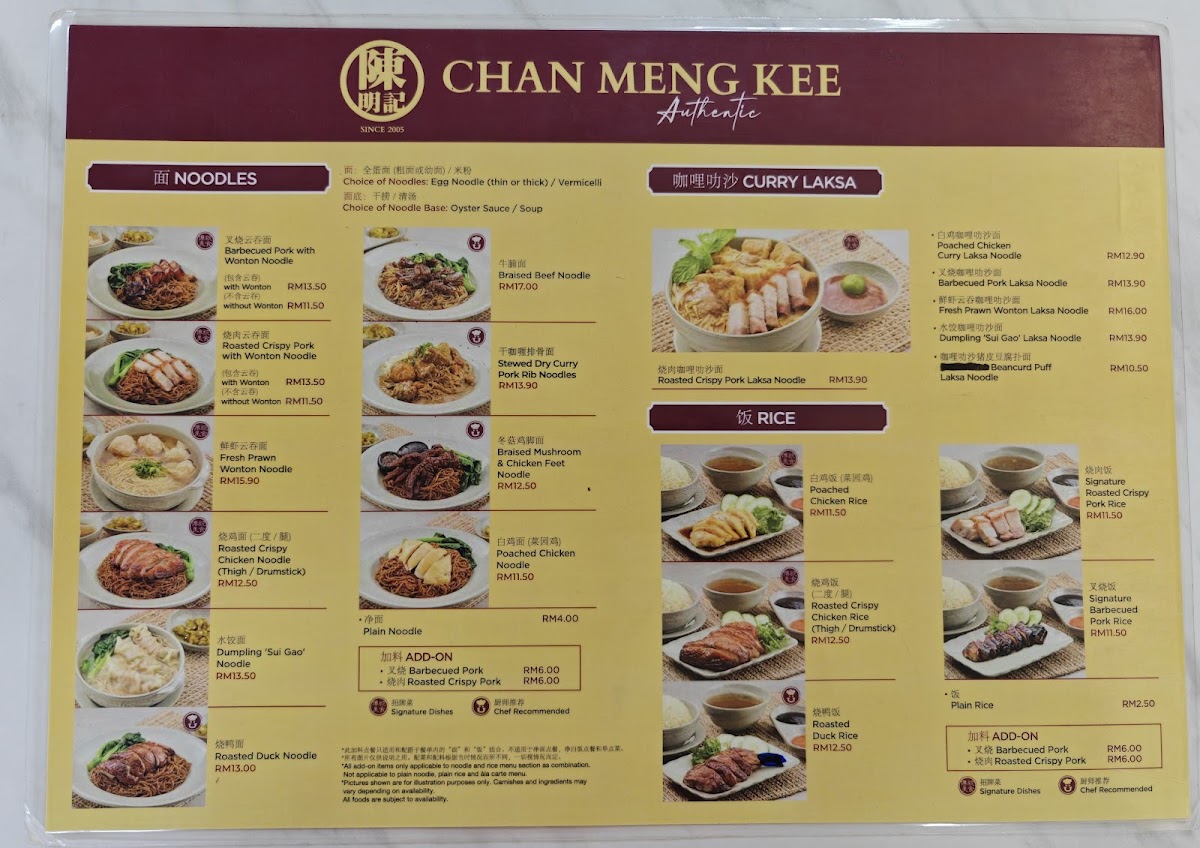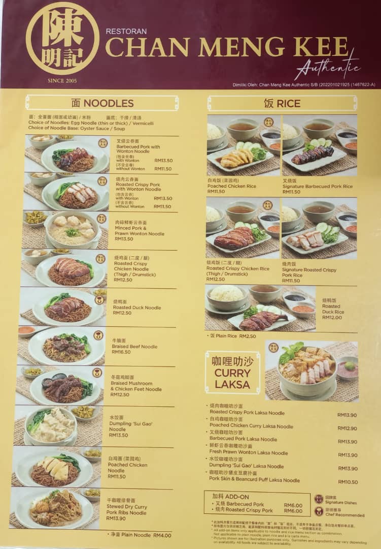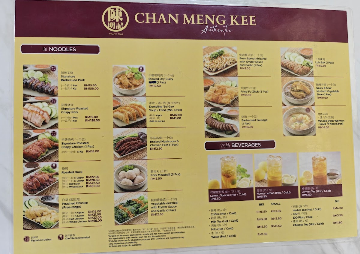 The menu offers a variety of traditional Chinese dishes focusing on noodles, rice, and roast meats. It is structured into categories including noodle dishes, rice plates, roast and steamed meats, soups, vegetables, and beverages. Popular items include Char Siew Wantan Noodles, Curry Roasted Pork Noodles, and Chicken Rice, showcasing a balance of savory and hearty flavors often found in local Chinese cuisine.