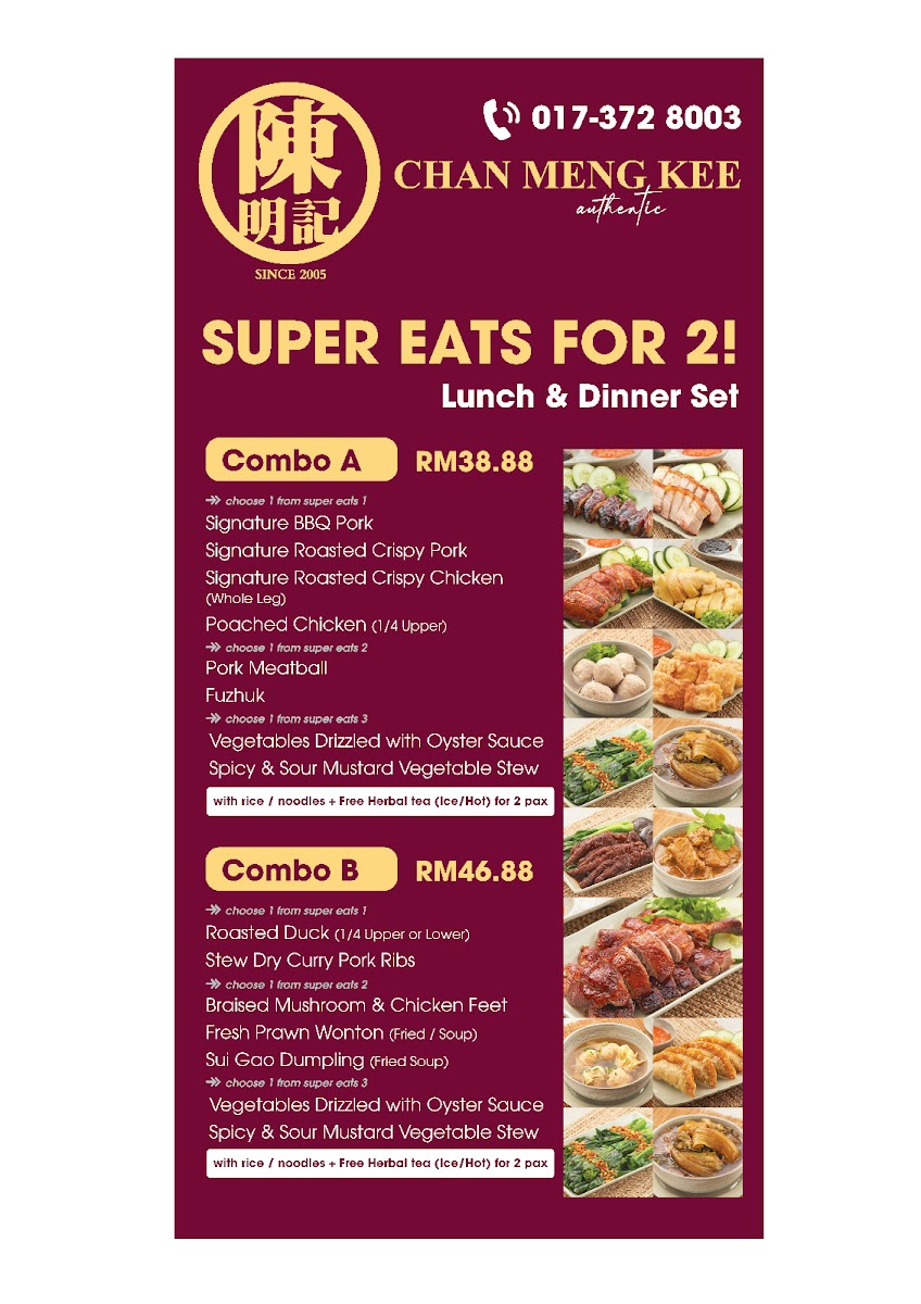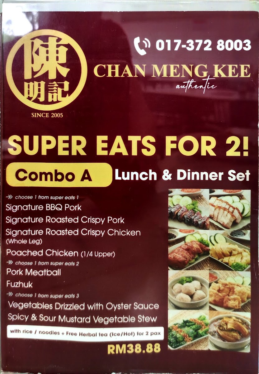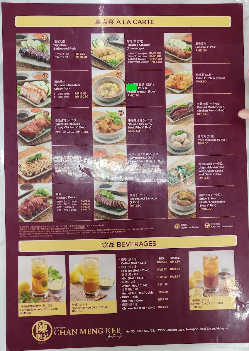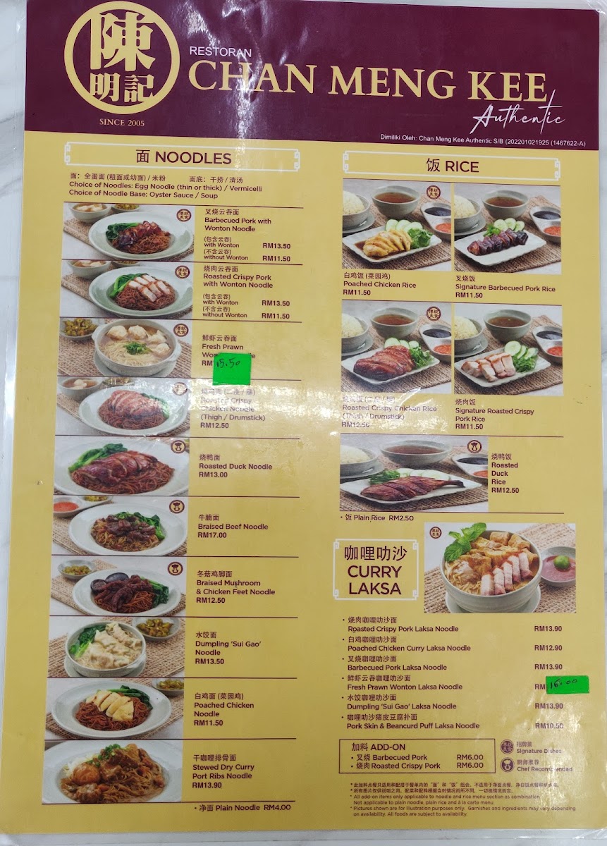 The menu offers a variety of traditional Chinese dishes focusing on noodles, rice, and roast meats. It is structured into categories including noodle dishes, rice plates, roast and steamed meats, soups, vegetables, and beverages. Popular items include Char Siew Wantan Noodles, Curry Roasted Pork Noodles, and Chicken Rice, showcasing a balance of savory and hearty flavors often found in local Chinese cuisine.
